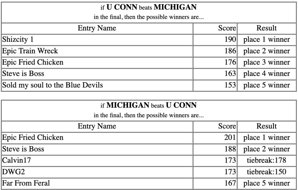 Well that wasn’t what a lot of people expected – a final game featuring UConn and Michigan, that is. TNT’s highly esteemed Ernie Johnson, in fact, claimed following the second game of a surprising Final Four outcome that “Nobody saw this coming.” Well, maybe Ernie should meet some of our EQE March Madness participants, because five of our entries predicted just such a matchup in the final game. Among those are the only two possibilities to win it all, Epic Fried Chicken, who finishes first with a Michigan win, and Shizcity 1, who walks away with a first place finish with a UConn win.