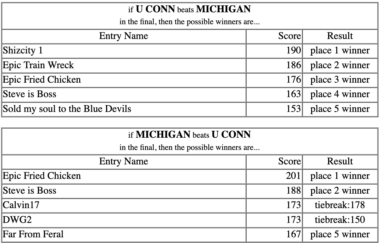 The odds on favorite with three possible combinations to come away winning it all is Epic Fried Chicken. Right on the heels with two possible winning combinations each is Big Ten and Shizcity 1 plus three more that need things to go exactly the right way. All possible outcomes are listed below with the five winners in order. In almost every scenario the tie breaker comes into play. Most interesting is a potential five-way tie for fifth place should Illinois and Michigan end up matching up in the Championship game. Oddly the entry labeled “Big Ten” comes away winning it all if Arizona and Illinois go at it in the final game, but is out of the money should the two Big Ten teams end up facing off.